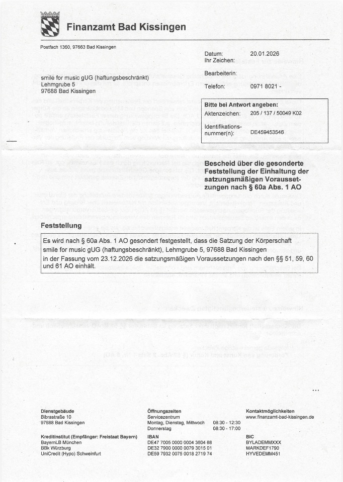 Von öffentlicher Seite (Finanzamt) wurde die Gemeinnützigkeit von smile for music gUG (haftungsbeschränkt) am 20. Januar 2026 bestätigt. Die Bestätigung findest Du hier. Vielen Dank für Dein Vertrauen.
